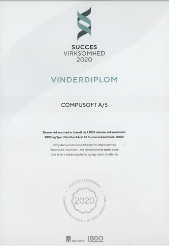 The Danish bank Spar Nord and the Danish consultancy and accountancy company BDO have named CompuSoft A/S "Success Company of the Year 2020".