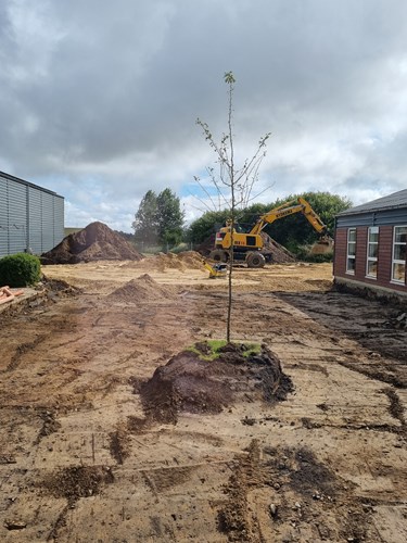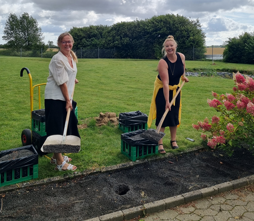 The excavator has arrived! Before the excavator can get to work, plants and stones must be moved so they can be reused in the new construction. Here Lene and Jane are in action.