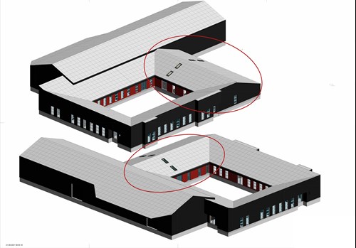 The picture shows a 3D drawing of the new extension. The extension unites our existing office building with our workshop and warehouse buildings. Thus, a closed courtyard is formed with four wings. In the courtyard, terraces and activities for employees and guests will be established.